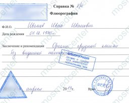 • документ, подтверждающий прохождение флюорографии — выдаётся после прохождения соответствующего обследования, требуется при оформлении медкнижки, при поступлении в образовательное учреждение, когда взрослый или ребёнок поступает в стационар;
