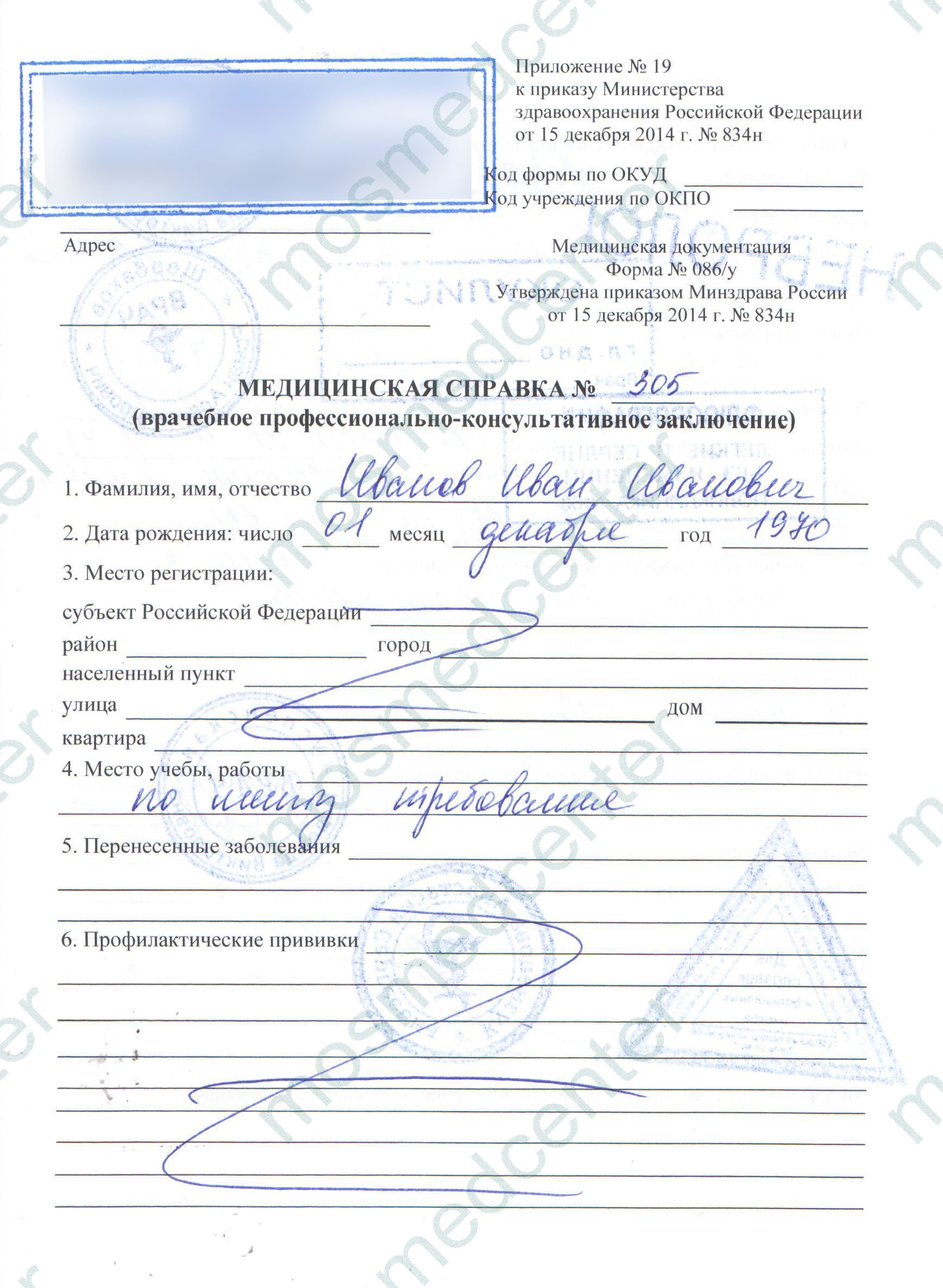 Требуемый бланк заполняется в соответствии с приказом Минздрава №834н от 15.12.2014 года. Выдавшее документ учреждение пропечатывает штамп со своими реквизитами сверху, на лицевой стороне. Тут же проставляется наименование справки 086у, её номер, фамилия, имя, отчество пациента согласно удостоверению личности, его место поступления или будущего трудоустройства. В специальных графах указываются имевшиеся острые и хронические заболевания.